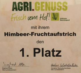 Unser Himbeer-Fruchtaufstrich wurde heute als bester Fruchtaufstrich des Landes ausgezeichnet. Nach der Expertenverkostung in der Laimburg (Vorverkostung) und direkt vor Ort in der Messe Bozen (Finalverkostung), durften wir heute diesen wunderschönen Preis entgegennehmen. Laut Jury überzeugte unser Fruchtaufstrich in Aussehen, Geruch, Geschmack, Textur und Gesamteindruck.