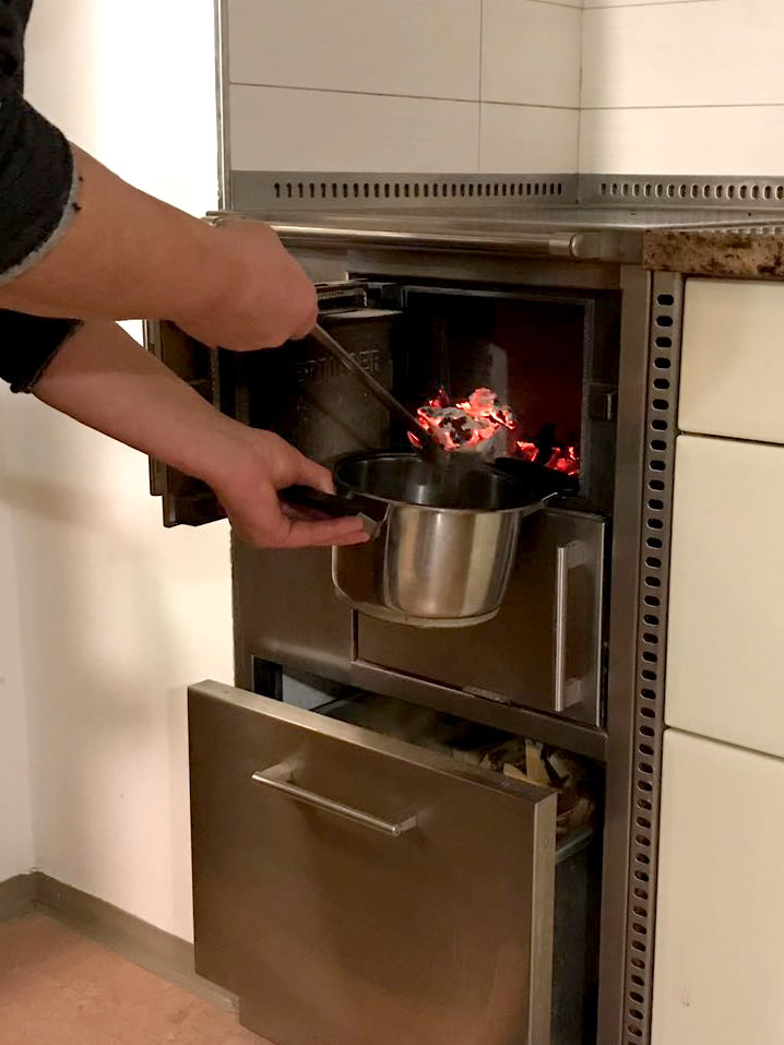 Der Bauer hat die Tiere im Stall versorgt, die Bäuerin das Rauchpfandl aus dem Keller geholt und das Holz im Küchenherd verbrennen lassen. Mit einer Zange gibt sie die glühenden Kohlen in das Rauchpfandl und verteilt Weihrauch darauf. Vor allem die Kinder lieben den würzigen Duft der schmelzenden Harzperlen.