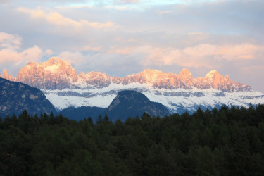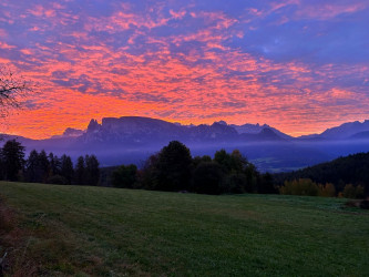 Die Dolomitenbewohner haben für dieses Phänomen eine eigene Geschichte erzählt, die Sage von König Laurin und seinem Rosengarten und da erzählt man sich: „Vor langer Zeit lebte im Felsmassiv des Rosengartens ein Zwergenvolk. König Laurin verliebte sich in die Tochter des Königs und plante, sie zu rauben. Doch die Männer des Königs zogen aus, um sie zurückzuholen. Um sich dem Kampf zu stellen, zog Laurin eine Tarnkappe über. Doch als er heimlich durch seinen Rosengarten schlich, verrieten die Blumen seine Position, und er wurde gefangen genommen. In seiner Wut verfluchte Laurin den Rosengarten, sodass er weder bei Tag noch bei Nacht blühen sollte –jedoch die Dämmerung vergaß er. So leuchtet der Rosengarten bis heute nur in den magischen Momenten des Sonnenuntergangs wenige Minuten und verzaubert alle, die das Glück haben, dieses Naturschauspiel zu erleben. Die Dolomiten, nicht umsonst ein „Weltnaturerbe“, sind bekannt für ihr außergewöhnlich farbintensives Leuchten – so intensiv, dass man auch von den Burning Dolomites („brennende Dolomiten“) spricht.